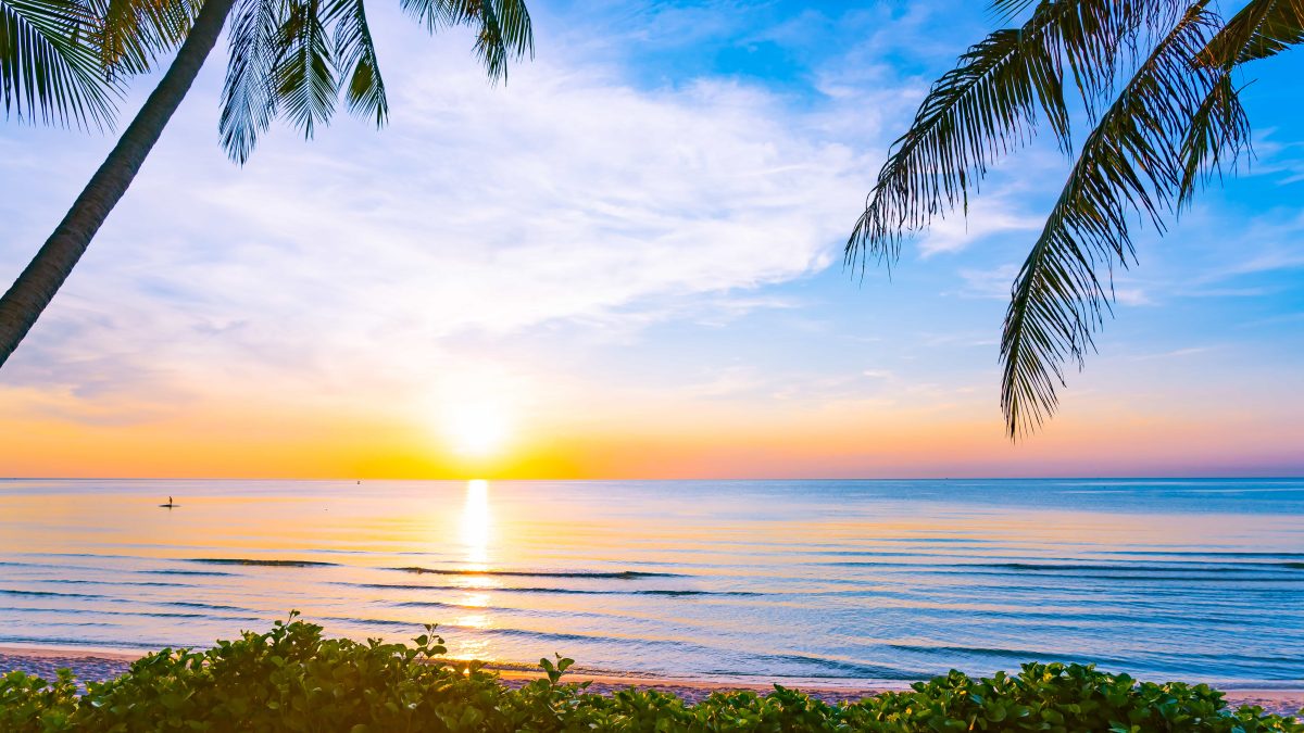 Beautiful outdoor nature landscape of sea and beach with coconut palm tree at sunrise or sunset for leisure travel and vacation